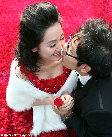 صيني يطلب يد صديقته بعد أن قدم لها فستانا تم صنعه من 10 آلاف وردة حمراء...بالصور