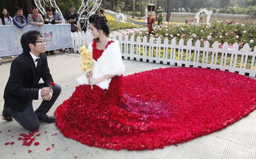 عمان تايمز"_ في محاولة منه لكسب قلب صديقته والحصول على موافقتها عندما يتقدم لطلب الزواج بها, تقدم الصيني (شياو فان Xiao Fan) لطلب يد شريكة حياته (يين مي Yin Mi) بطريقة مميزة تتناسب مع ولعها الخاص بالأزياء والموضة, بحيث قدم لها فستانا من الورد الخالص أستخدم في صناعته 9,999 وردة طبيعية حمراء تم رصفها جنبا إلى جنب بواسطة فريق عمل أستمر بالعمل على مدار الساعة في أجواء رطبة وباردة نسبيا للمحافظة على بتلات الورد كي لا تذبل وتفقد لونها الأحمر المميز. الصورة التالية تظهر الفستان واللحظة التي قام العريس بالتقدم لخطبة عروسه.شد العريس وعروسه المكللة بالورد أنظار المارة والحضور وبعض وسائل الإعلام بحيث تقدم العريس لعروسه في أحد المنتزهات العامه وهو (متنزه تشايم لونج الترفيهي Chime-Long Paradise amusement park) وهو أحد معالم الجذب السياحي في جوانجدونج في شمال الصين.